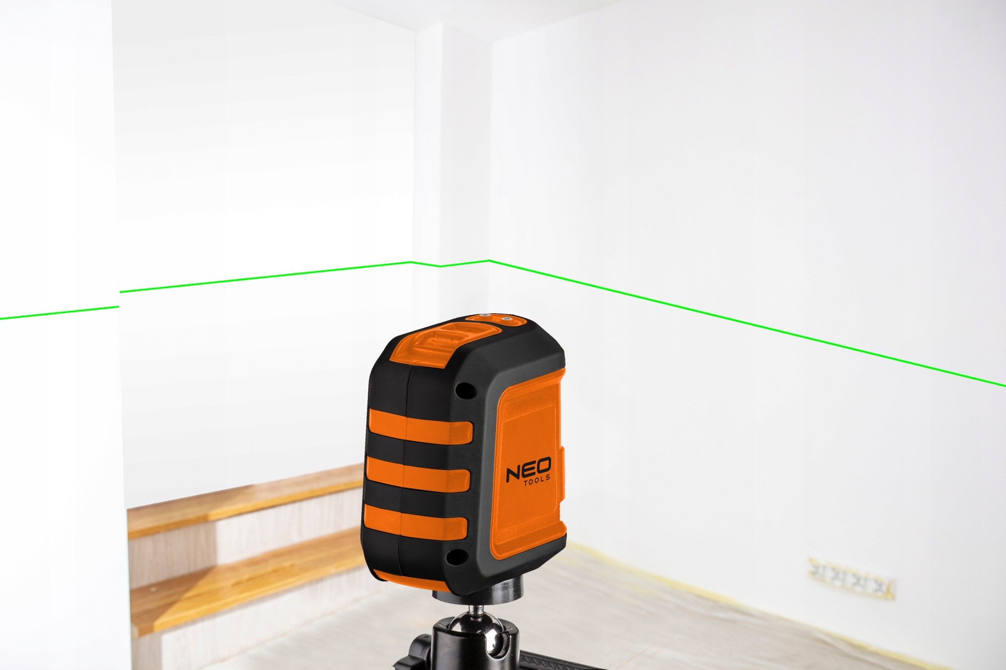 Laser krzyżowy samopoziomujący NEO o długości fali 520-530 nm znajduje zastosowanie przy pracach budowlanych i wykończeniowych. Produkt służy do wyznaczania linii pionowej, poziomej oraz obu linii równocześnie na dystansie do 15 metrów. Zielona wiązka światła jest do 4 razy jaśniejsza niż standardowa czerwona. Laser krzyżowy wyposażony jest w mechanizm samopoziomujący w zakresie +/- 4°, co umożliwia dokładną pracę bez konieczności ręcznego wprowadzania ustawień.