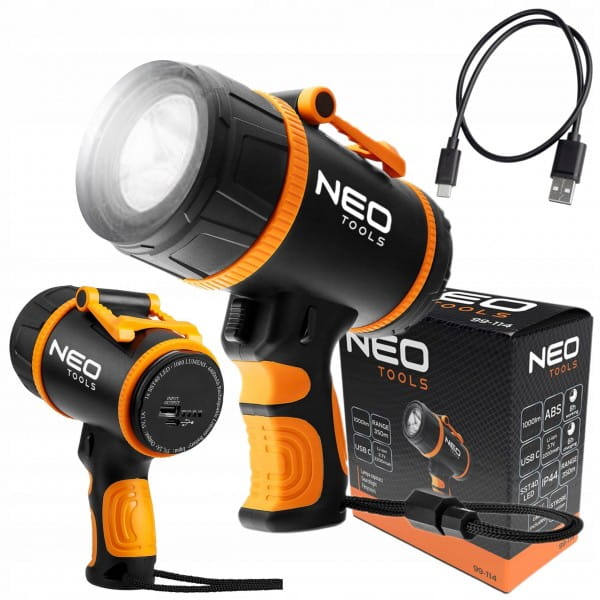 Lampa szperacz 1000 lm 99-114 NEO TOOLS to lampa LED o mocy 1000 lumenów i zasięgu do 350 metrów, będąca wyjątkowo funkcjonalnym narzędziem, które znajdzie zastosowanie w wielu sytuacjach. Wykonana z trwałych materiałów ABS i TPR, jest odporna na wodę i pył (IP44), sprawiając, że nadaje się do użytku w różnych warunkach atmosferycznych. Bateria litowo-jonowa 18650 o pojemności 4400 mAh zapewnia od 4 do 8 godzin pracy, w zależności od wybranej mocy oświetlenia (100% lub 50%), a także funkcję SOS dla sytuacji awaryjnych.