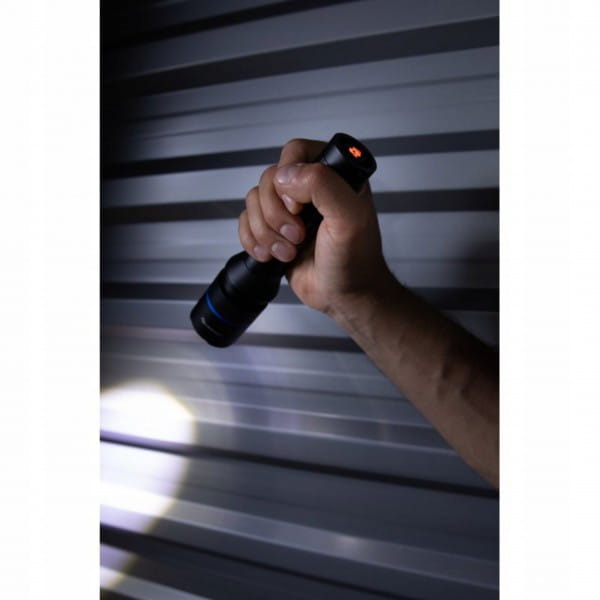 Lekka, wytrzymała aluminiowa latarka z wydajnymi diodami LED. Wodoodporna obudowa o klasie IPX7 chroni przed skutkami zanurzenia w wodzie na głębokość do 1 metra przez 30 minut.