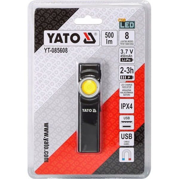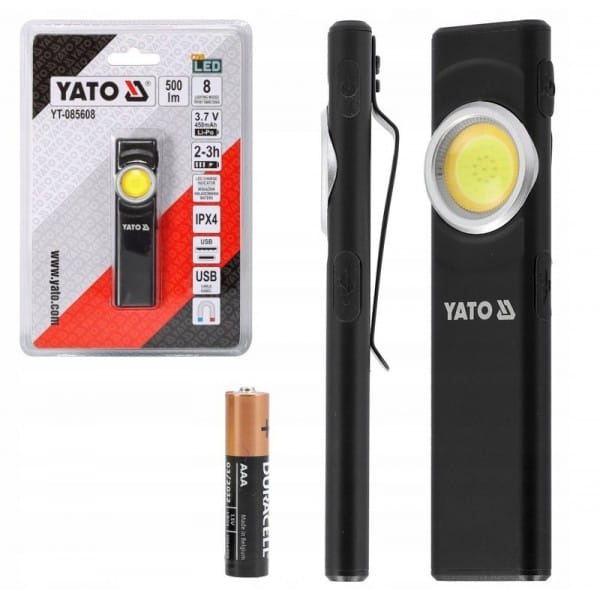 Mała i poręczna latarka YATO z dwoma rodzajami światła i ośmioma trybami pracy, które pozwalają dostosować oświetlenie do warunków i wykonywanych czynności.