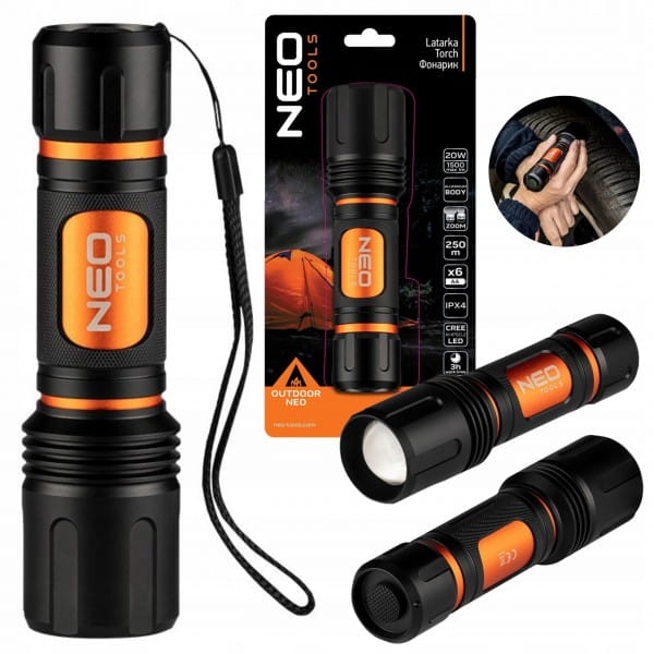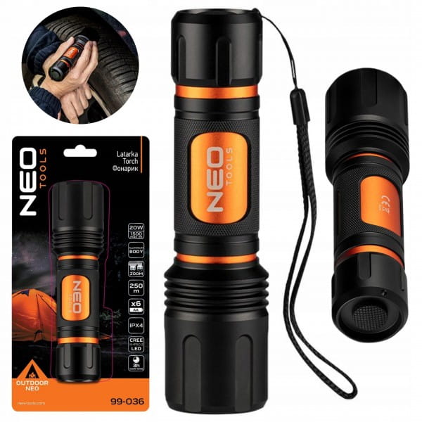 Latarka bateryjna NEO (nr ref. 99-036) z zoomem wyposażona jest w nowoczesne diody LED CREE XHP50.2 o strumieniu świetlnym 1500 lumenów i mocy 20W. Latarka zasilana jest 6 bateriami AA (brak w zestawie). Korpus wykonany został z aluminium. Latarka posiada 3 funkcje świecenia: 100%, 20% oraz stroboskop.