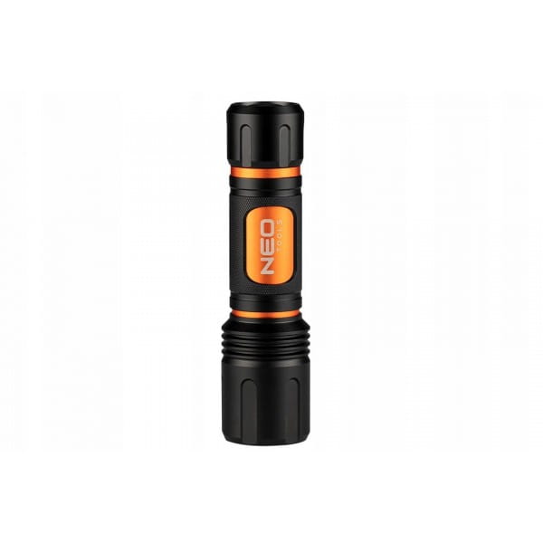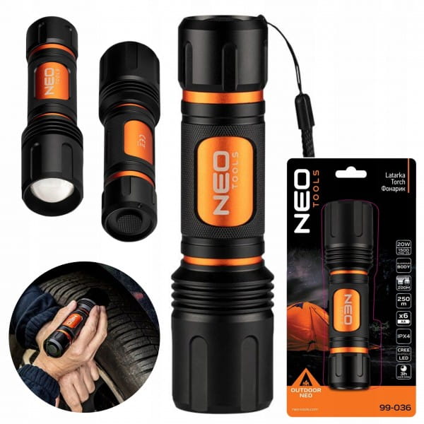 Latarka bateryjna NEO (nr ref. 99-036) z zoomem wyposażona jest w nowoczesne diody LED CREE XHP50.2 o strumieniu świetlnym 1500 lumenów i mocy 20W. Latarka zasilana jest 6 bateriami AA (brak w zestawie). Korpus wykonany został z aluminium. Latarka posiada 3 funkcje świecenia: 100%, 20% oraz stroboskop.