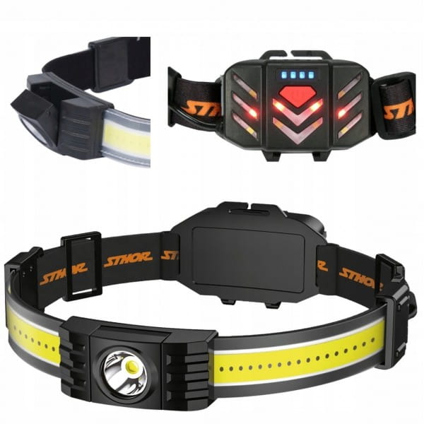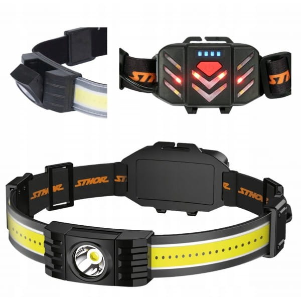 - Tryby świecenia: 5: COB, POWER, COB + POWER, czerwona dioda, czerwona dioda SOS, dodatkowy tryb: tylne światło ostrzegawcze w kolorze czerwonym i białym