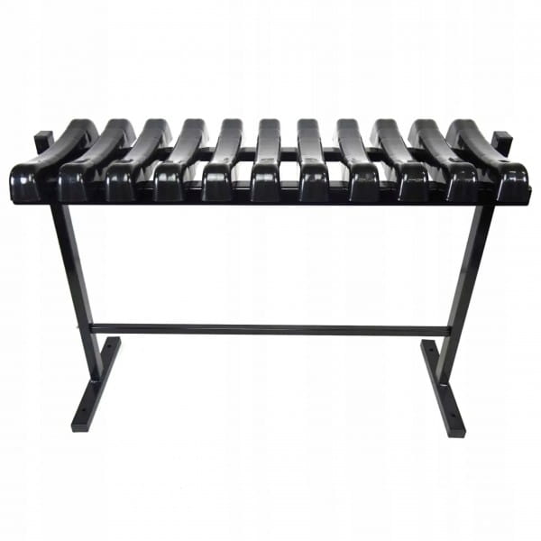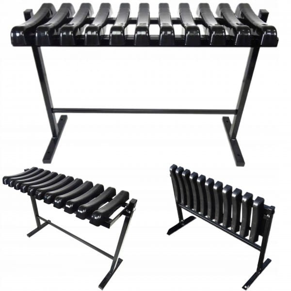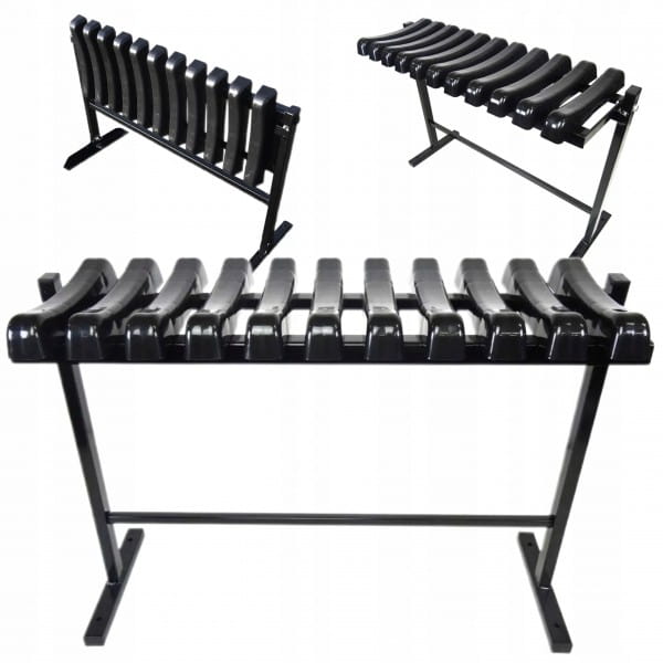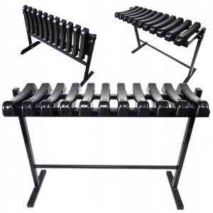 - Stalowy stelaż – gwarantuje stabilność ławki, solidność oraz odporność na obciążenia