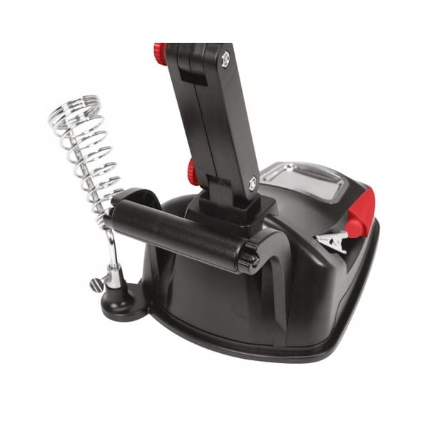 Uchwyt typu "trzecia ręka" z podświetleniem w kształcie pierścienia z 10 diod LED. Podwójna lupa - większa o średnicy 75 mm zapewnia powiększenie x 3. Mniejsza lupa - wbudowana, o średnicy 20 mm powiększa obraz x 4,5. Obrotowe ramię 360 stopni z regulacją kąta w trzech miejscach umożliwia swobodną pracę zarówno w obszarze pomocniczych klipsów, jak i poza nim. Dwa krokodylki osadzone na ruchomych ramionach oraz na podwójnych przegubach kulowych dają szerokie możliwości dostosowania klipsów zarówno do drobnej biżuterii, jak i niewielkich rozmiarów płytek PCB. Podstawka na gąbkę lutowniczą, gniazdo na kolbę, rolka do zamontowania spoiwa lutowniczego oraz schowek np. na śrubki z demontażu pomagają w organizacji pracy.