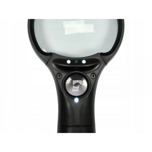 Lupa z podświetleniem z dwiema soczewkami. Obudowa wykonana z solidnego tworzywa sztucznego. Dwa szkła powiększające. Większe - szklane, o średnicy 75 mm powiększa x3. Mniejsze - z akrylu, o średnicy 20 mm powiększa aż x45. Podświetlenie z trzech diod LED lub pojedynczej diody UV ułatwia inspekcję połączeń lutowniczych, odczytanie napisów z układów SMD, czy chociażby czytanie w ciemności.