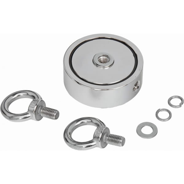 Dzięki solidnej obudowie z dopasowaną grubością ścianki siła przyciągania jest maksymalnie ukierunkowana na odsłoniętą powierzchnię magnesu, co znacznie poprawia efektywność jego działania. Model KD10416 wyposażono również w dwa uchwyty — górny i boczny — umożliwiające pracę w różnych płaszczyznach. W zestawie znajduje się mocna lina o długości 20 metrów oraz karabińczyk, który pozwala na szybkie odpięcie magnesu, co jest niezwykle przydatne podczas trudnych znalezisk.