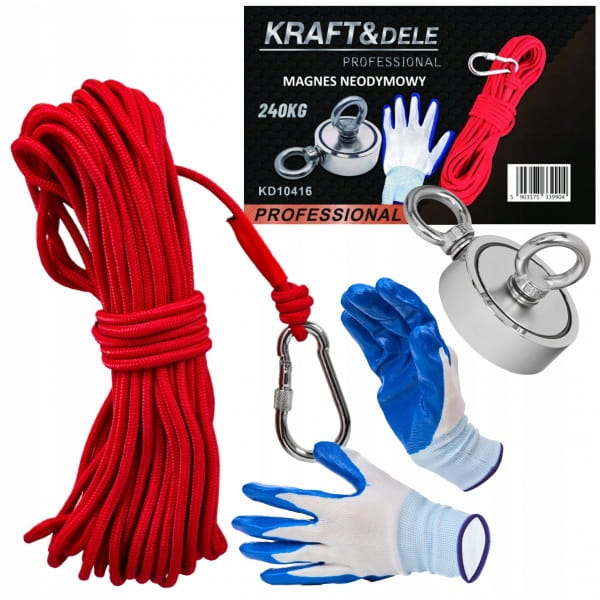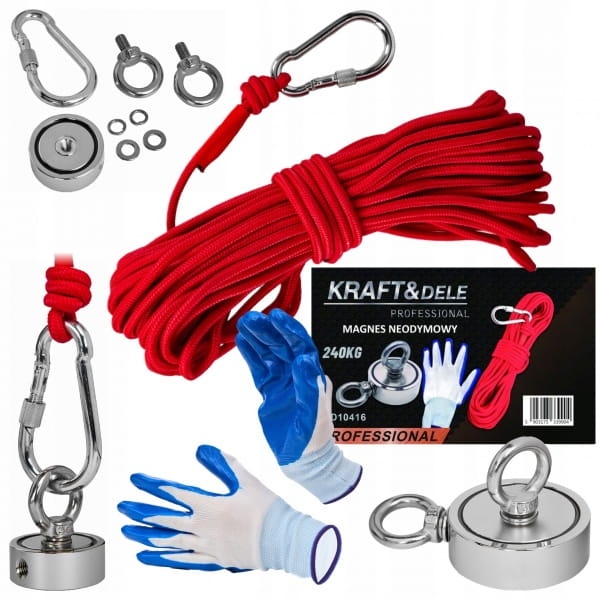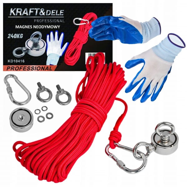 MAGNES NEODYMOWY DO POSZUKIWAŃ W WODZIE 240KG ZESTAW Z RĘKAWICAMI LINĄ 20M