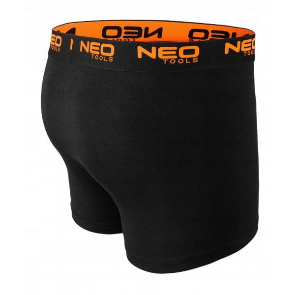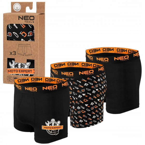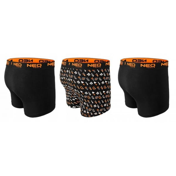 Bokserki basic, 3-pack, 81-679 NEO TOOLS to wygodne bokserki męskie, wykonane z dzianiny single jersey 95% bawełny i 5% elastanu. Dzięki niemu zapewniają wyjątkowy komfort noszenia. Cechują się gramaturą 180g/m2. Dostępne w gładkim, czarnym kolorze oraz w wersji z nadrukiem punktowym na nogawce i z narzędziowym wzorem w kolorach biało-pomarańczowych. Elastyczna, miękka guma z pomarańczowym logiem marki zapewnia wygodne dopasowanie. Płaskie szwy na przednim panelu i brak szwów bocznych zapobiegają uciążliwym odciskom. Dodatkowy panel w kroku zwiększa wygodę i swobodę ruchów.