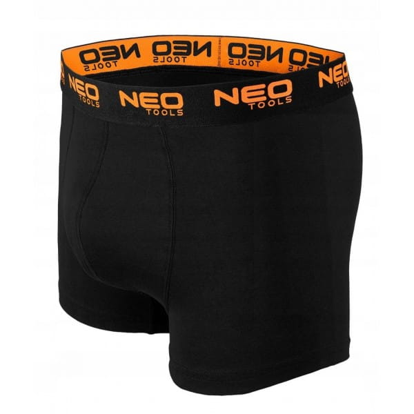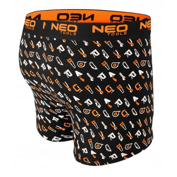 Bokserki basic, 3-pack, 81-679 NEO TOOLS to wygodne bokserki męskie, wykonane z dzianiny single jersey 95% bawełny i 5% elastanu. Dzięki niemu zapewniają wyjątkowy komfort noszenia. Cechują się gramaturą 180g/m2. Dostępne w gładkim, czarnym kolorze oraz w wersji z nadrukiem punktowym na nogawce i z narzędziowym wzorem w kolorach biało-pomarańczowych. Elastyczna, miękka guma z pomarańczowym logiem marki zapewnia wygodne dopasowanie. Płaskie szwy na przednim panelu i brak szwów bocznych zapobiegają uciążliwym odciskom. Dodatkowy panel w kroku zwiększa wygodę i swobodę ruchów.