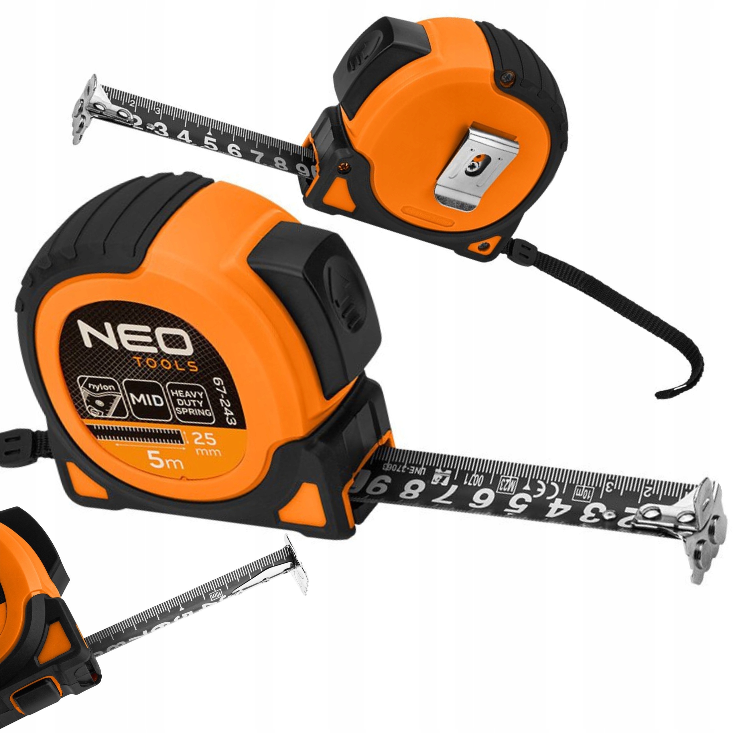 Miara zwijana stalowa Super Black 5 m x 25 mm, auto blokada, dwa przyciski stop, magnes 67-243 marki NEO TOOLS to narzędzie z taśmą o długości 5 m i szerokości 25 mm. Wyposażone w praktyczną funkcję autostopu, która zapobiega samoistnemu zwijaniu się miarki po wysunięciu, jak i możliwości użycia dwóch blokad. Magnes ułatwia lepszą stabilizację miary, a dwustronny nadruk wpływa na szybkość odczytu wymiarów. Miara NEO TOOLS wykonana została z dwumateriałowej obudowy. Posiada czarną matową powłokę chroniącą podziałkę przed starciem. Z kolei wbudowany amortyzator wpływa na bardziej łagodny proces zwijania taśmy. Narzędzie posiada zgodność z dyrektywą MID class II. Dodatek czarnego nylonu wpływa na odpowiednią wytrzymałość oraz wygodę użytkowania tej miary NEO TOOLS.