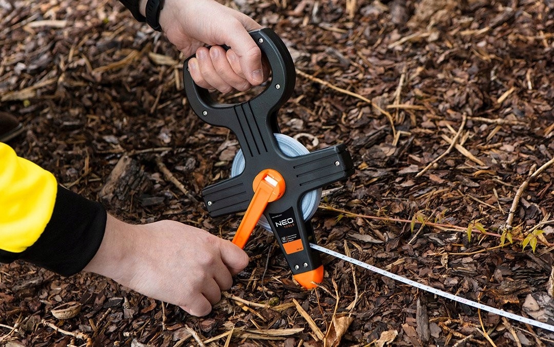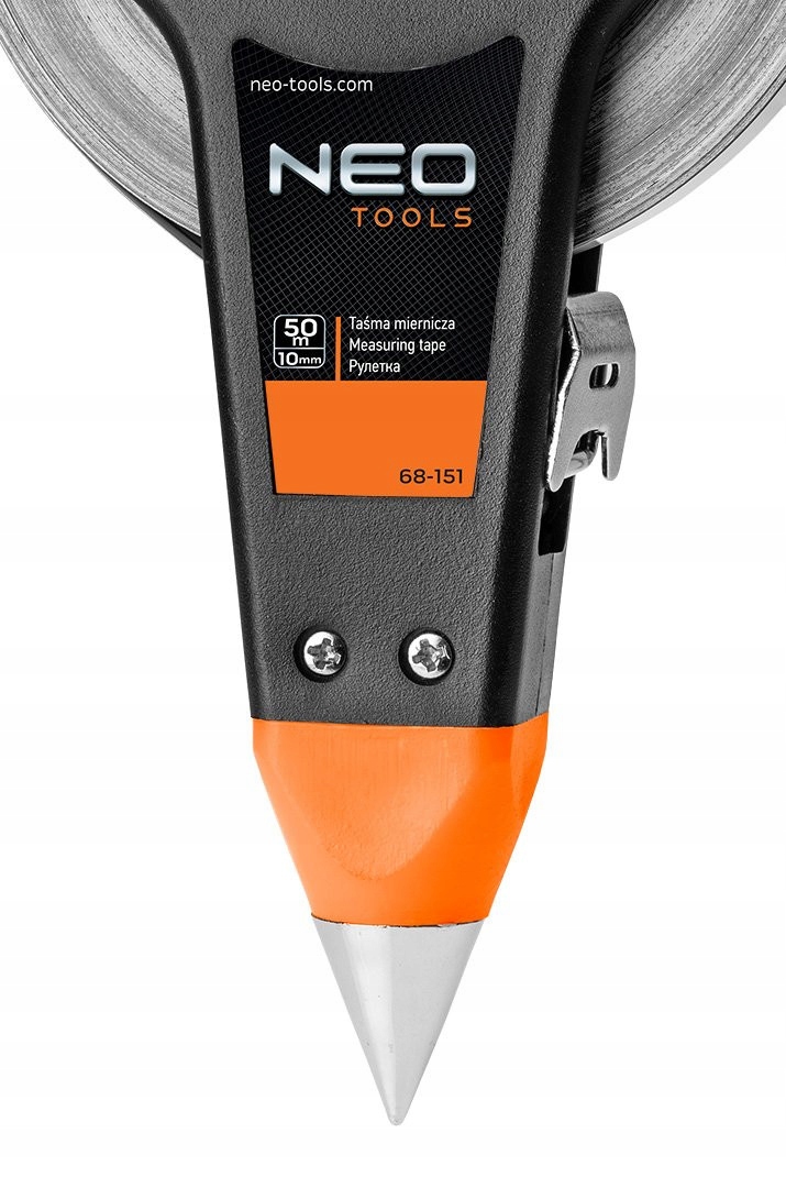 Taśma miernicza stalowa 50 m x 10 mm 68-151 NEO - narzędzie umożliwiające wykonanie pomiarów w zakresie do 50 metrów. To typ miary geodezyjnej, przydatnej w różnego rodzaju pracach pomiarowych. Taśma wykonana została z trwałego materiału, posiadającego właściwości sprężynowe, co ułatwia jej rozwijanie i zwijanie. Obudowa z mocnego tworzywa sztucznego jest odporna na uszkodzenia i dodatkowo uzupełniona spiczastą końcówką. Umożliwia ona szybki montaż narzędzia w ziemi, doskonale sprawdzający się szczególnie przy długich pomiarach. Ergonomiczny uchwyt pokryty antypoślizgowym materiałem zapewnia pewny chwyt i ułatwia manewrowanie taśmą. Taśma miernicza stalowa od marki NEO polecana jest profesjonalistom.
