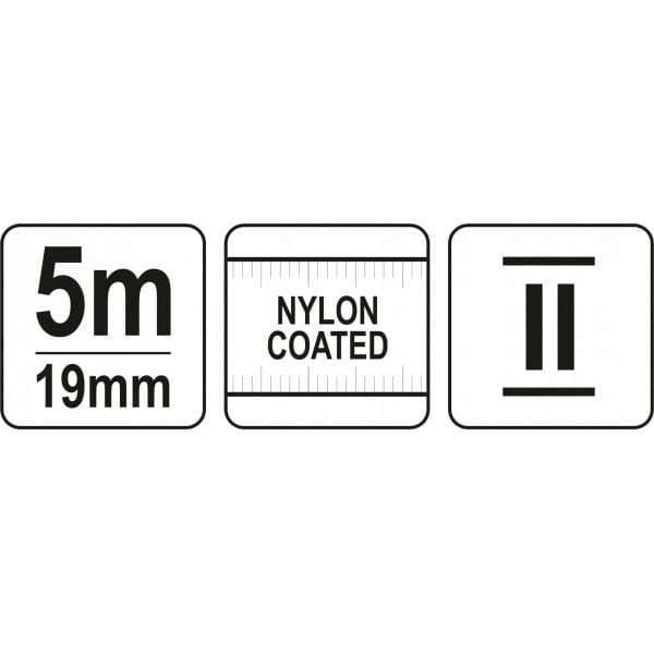 Miara zwijana z taśmą stalową, wykonana w II klasie dokładności. Taśma ze specjalnej , sprężystej blachy , lakierowana i dodatkowo zabezpieczona powłoką nylonową chroniącą przed wilgocią , ścieraniem a także blaknięciem pod wpływem światła słonecznego. Zakończona ruchomym hakiem /przystosowanym do pomiarów wewnętrznych i zewnętrznych /. Kolor taśmy żółty , na górnej i dolnej krawędzi naniesiona podziałka milimetrowa . Zwarta obudowa wykonana z odpornego na uszkodzenia mechaniczne tworzywa abs. Miara posiada dwie blokady wysuwu taśmy . Przycisk umieszczony w podstawie służy do chwilowego zablokowania , klawisz na froncie obudowy po przesunięciu blokuje taśmę trwale.. Dla wygody użytkownika wyposażona w klips mocujący i krótką smycz.