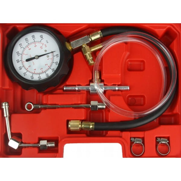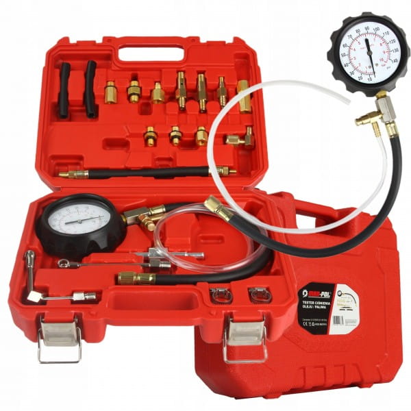Zestaw zawiera adaptery i kształtki pasujące do większości układów wtrysku paliwa. Manometr z podwójną skalą: 0 - 140 psi oraz 0 - 10 bar.