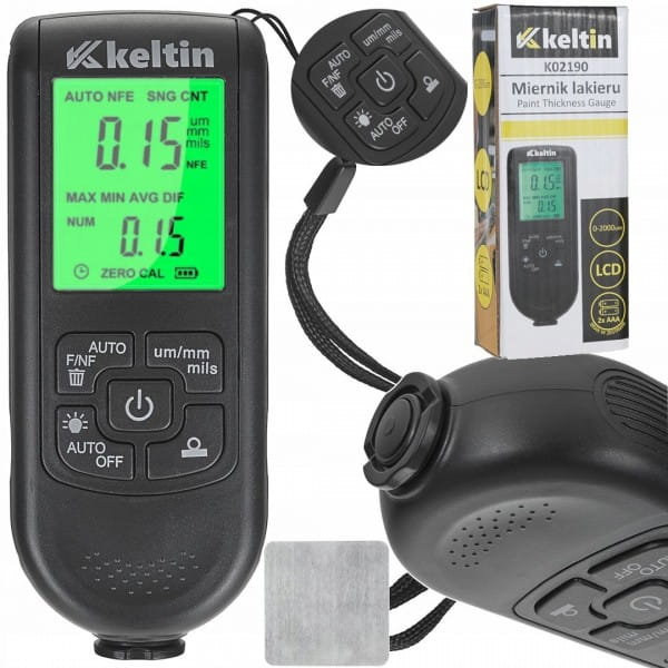- Zawartość zestawu: miernik lakieru, płytka kalibracyjna oraz 6 kawałków folii o różnej grubości