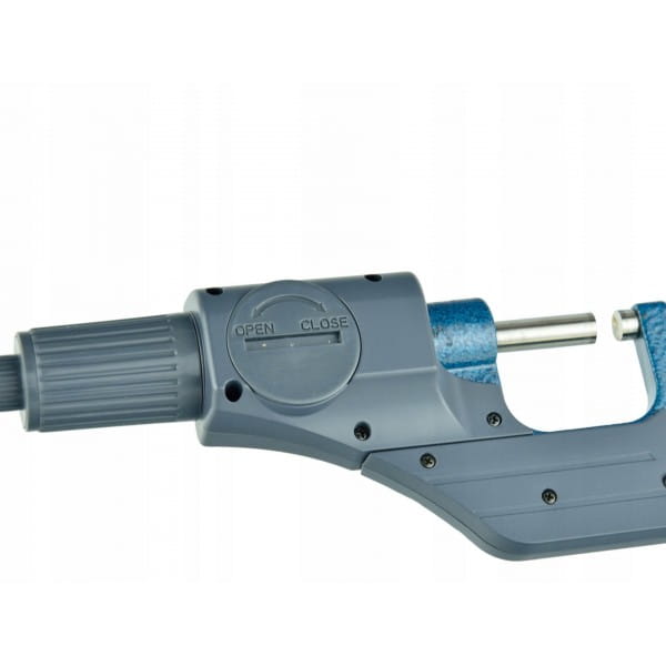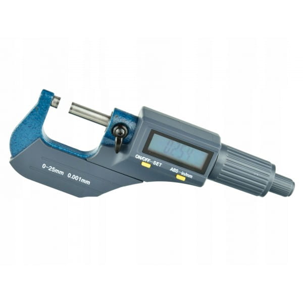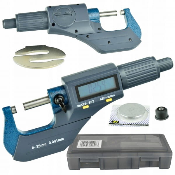 Precyzyjny mikrometr elektroniczny. Powszechnie wykorzystywany do precyzyjnego pomiaru niewielkich odległości w inżynierii mechanicznej i innych branżach mechanicznych. Jasny wyświetlacz LCD pozwala na łatwy odczyt pomiaru. Przy korpusie znajduje się zacisk dźwigowy, ustalający położenie kowadełka. W skład zestawu wchodzi kulka stalowa w gumowym mocowaniu umożliwiającym montaż na powierzchni pomiarowej mikrometru. Ułatwia ona pomiar elementów o małej powierzchni.