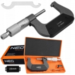 Ten model mikrometru ma długość 170 mm, 80 mm szerokości oraz 25 mm wysokości. Jego waga wynosi 370 g. Przyrząd pomiarowy wyróżnia się wysoką jakością wykonania. Zawiera czytelną skalę oraz cechuje się płynną pracą bębna. Zestaw składa się na mikrometr noniuszowy marki NEO, wzorzec, praktyczny kluczyk do zerowania oraz pudełko z tworzywa.