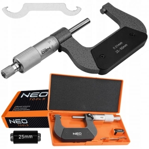 Mikrometr noniuszowy 25-50 mm 75-021 NEO to precyzyjne urządzenie, przeznaczone do dokonywania dokładnych pomiarów nawet bardzo małych elementów, z dokładnością do ± 0,01 mm. Narzędzie będzie niezbędne w każdym warsztacie samochodowym, zakładach przemysłowych, ale również w domu, podczas remontów oraz drobnych napraw. Charakteryzuje się bardziej precyzyjnymi wynikami niż suwmiarki.