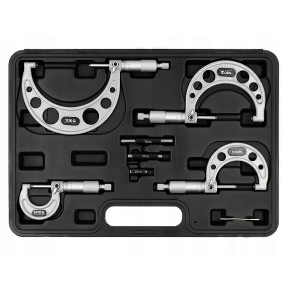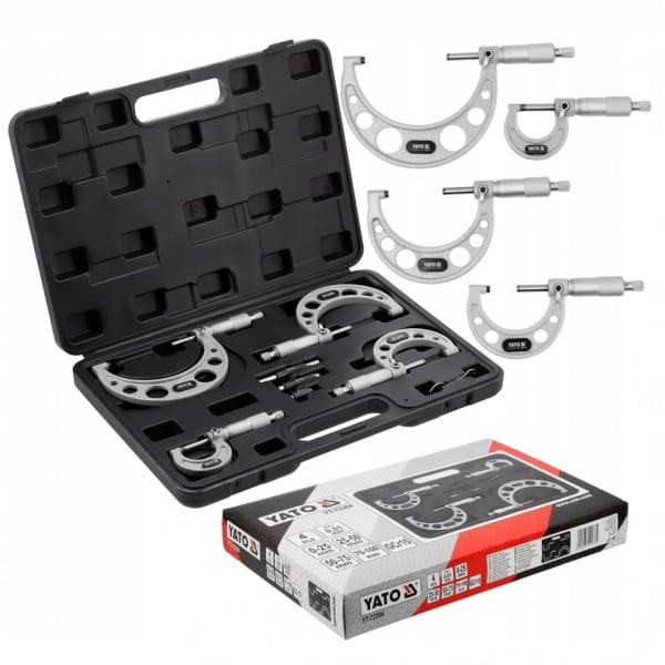 Zestaw czterech mikrometrów zewnętrznych YATO to wysokiej klasy narzędzia pomiarowe przeznaczone do dokładnego określania wymiarów zewnętrznych elementów o małych tolerancjach.