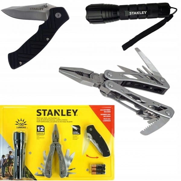 - Potrójne opakowanie zawierające latarkę STANLEY® 150 Lumenów, narzędzie wielofunkcyjne STANLEY® 12 w 1 oraz nóż składany STANLEY®.