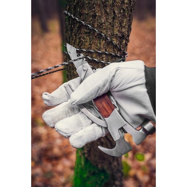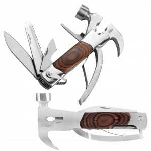 Multitool 13 w 1 stal nierdzewna, uchwyt drewniany, szczypce, szczypce do nakrętek, obcinak przewodów, kleszcze do wyciągania gwoździ, młotek, wkrętak płaski 2x, wkrętak PH, mały nóż, duży nóż, otwieracz do puszek, piła, pilnik, pouch nylonowy z uchwytem na pasek.