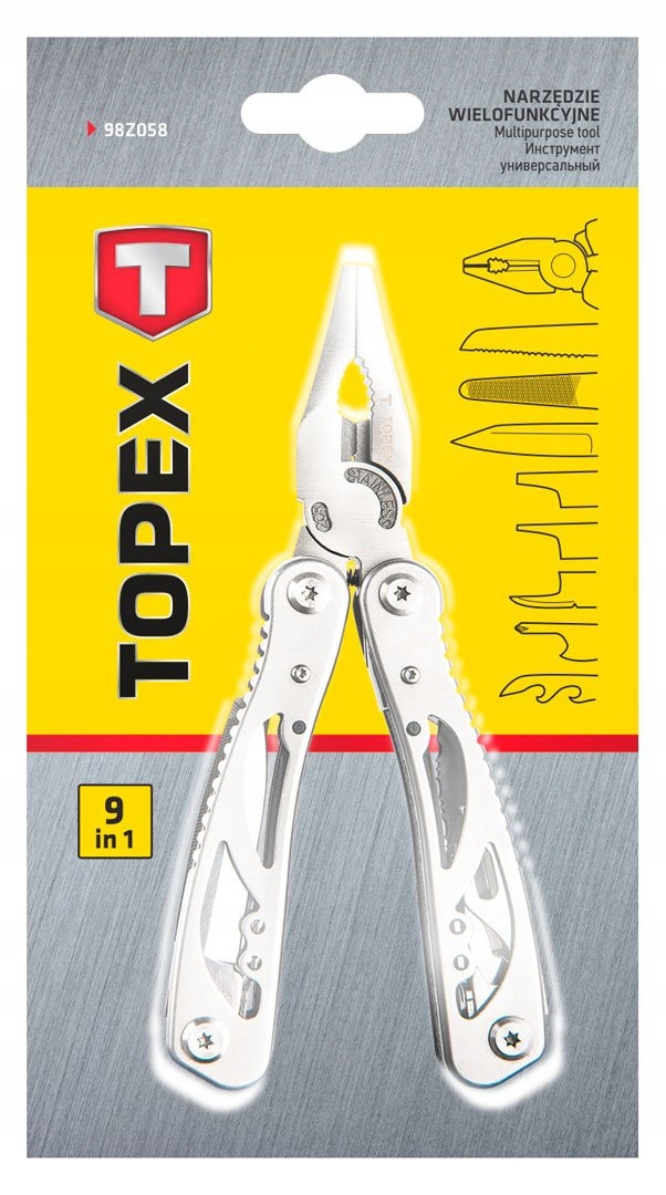 Narzędzie wielofunkcyjne TOPEX (nr ref. 98Z058) o długości 165 mm. Korpus ze stali nierdzewnej zapewni wytrzymałość i odporność na korozje. W jednym narzędziu znajduje się wiele różnych funkcji, m.in. najpopularniejszy wkrętak PH2, ostry nóż niezbędny w wielu sytuacjach oraz potrzebny na wielu kempingach otwieracz do puszek i butelek.. Pokrowiec z wytrzymałego nylonu ułatwia przechowywanie i transport. Marka TOPEX skierowana jest do majsterkowiczów.