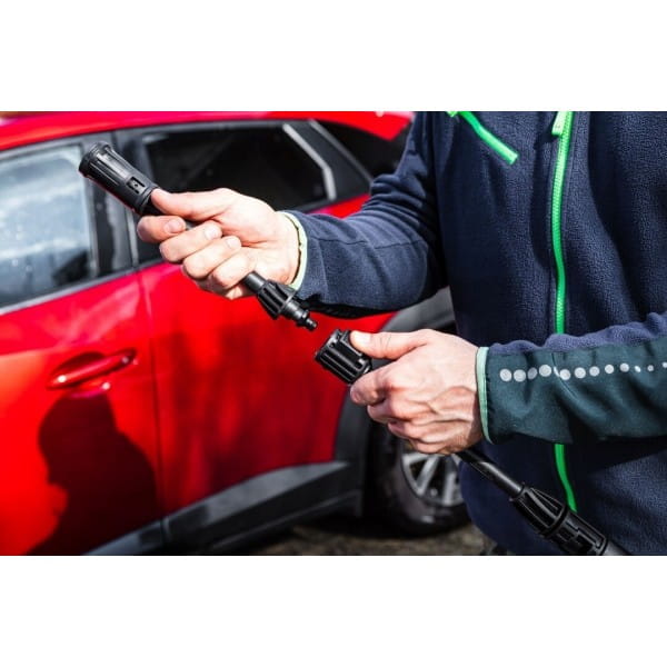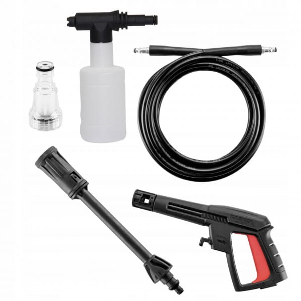 Urządzenie wyposażono w zestaw akcesoriów, m.in. rękojeść pistoletową z lancą, wąż, zbiornik na detergent, uchwyt na wyposażenie, złącze wlotu wody z filtrem i przetyczkę do czyszczenia dyszy.