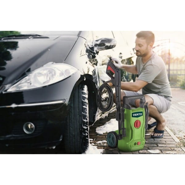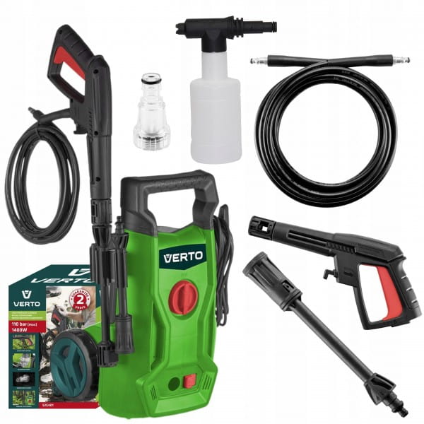 Myjka ciśnieniowa 1400 W, ciśnienie 80 (maks. 110) bar 52G401 VERTO jest urządzeniem przydatnym w każdym ogrodzie, garażu oraz na podjeździe, zaprojektowanym z myślą o oszczędzaniu wody, czasu oraz ułatwianiu sezonowych porządków.