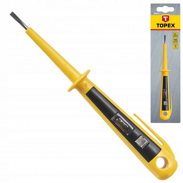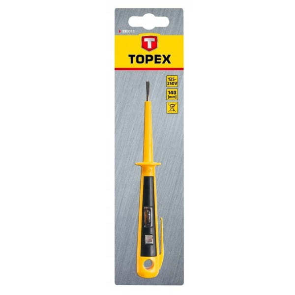Próbnik instalacji elektrycznej TOPEX (nr ref. 39D058) o długości 140 mm. Pozwala wykrywać przepływ napięcia w zakresie 125 - 250V, izolowany. Ergonomiczny kształt sprawia, że produkt prawidłowo leży w dłoni, co podnosi komfort pracy. Zgodność z europejskimi standardami bezpieczeństwa zapewnia certyfikat CE. Marka TOPEX skierowana jest do majsterkowiczów.