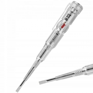 Próbnik instalacji elektrycznej 70-250 V AC 94-008 marki NEO TOOLS to urządzenie wyposażone w funkcję kontaktową (zakres 70 – 250 V AC) oraz bezkontaktową (70 – 600 V AC). Oferuje test ciągłości i test baterii (9 V, 1,5 V). Posiada praktyczną lampkę LED. Urządzenie marki NEO TOOLS charakteryzuje się długością 140 mm. Zasilane jest bateriami 2x LR41, dostępnymi w zestawie z próbnikiem. Jego obsługiwana częstotliwość wynosi od 50 – 500 Hz. Próbnik instalacji elektrycznej posiada płaską końcówkę wkrętaka. To proste i wielofunkcyjne narzędzie polecane zarówno elektrykom jak i amatorom do drobnych napraw w domu.