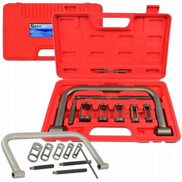 Zestaw do montażu i demontażu zaworów głowicy. Przyrząd przystosowany do pracy z silnikami diesla oraz benzynowymi. Zestaw zawiera pięć specjalnych końcówek dostosowanych do talerzyków zaworów o różnej średnicy. Urządzenie pozwala na wymianę zaworów, docieranie zaworów, wymianę sprężyn zaworowych oraz wymianę uszczelniaczy zaworowych