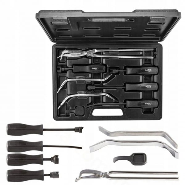 Zestaw do montażu szczęk hamulcowych - zestaw 8 szt. 11-131, NEO TOOLS zestaw przeznaczony dla profesjonalnych warsztatów, serwisów samochodowych oraz przydomowych garażów. W skład zestawu wchodzą: szczypce do sprężyn, 2 łyżki do zdejmowania i pasowania szczęk, ściągacz do sprężyn, 3 narzędzia do instalacji sprężyn ustalających, narzędzie do zdejmowania sprężyn. Całość zapakowana w wygodną walizkę, gdzie każdy element kompletu ma swoje miejsce.