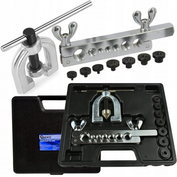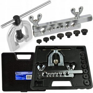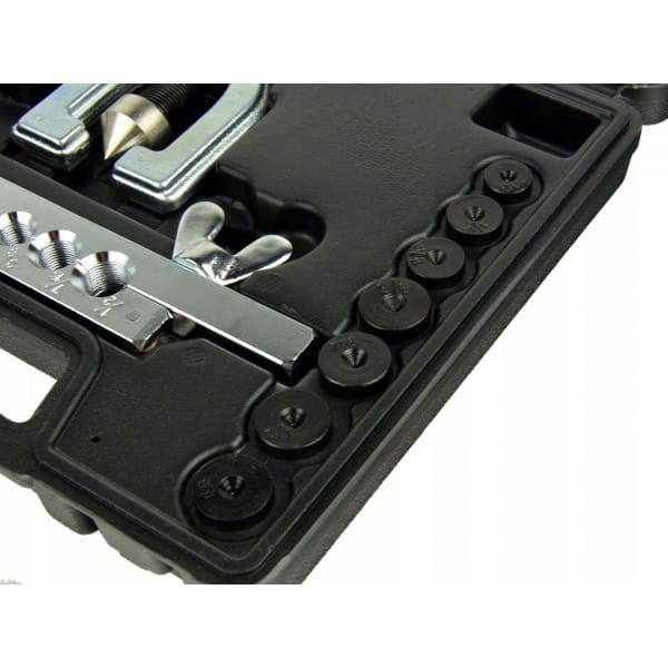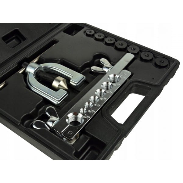 Zestaw do zarabiania przewodów hamulcowych i paliwowych. Nadaje się do cięcia i kielichowania miedzianych, mosiężnych, aluminiowych rurek i przewodów o ściankach o grubości do 1mm.