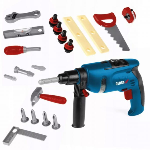 W zestawie oprócz urządzenia, znajduje się cały szereg osprzętu do niego jak wiertła oraz akcesoriów jak miarka, piła ręczna czy poziomnica – dzięki temu każde dziecko poczuć się będzie mogło jak prawdziwy majsterkowicz. Dodatkowo całość spakowana jest w walizkę podobną do tych w jakich przechowuje się fachowe elektronarzędzia, co jeszcze bardziej urealnia zabawę.