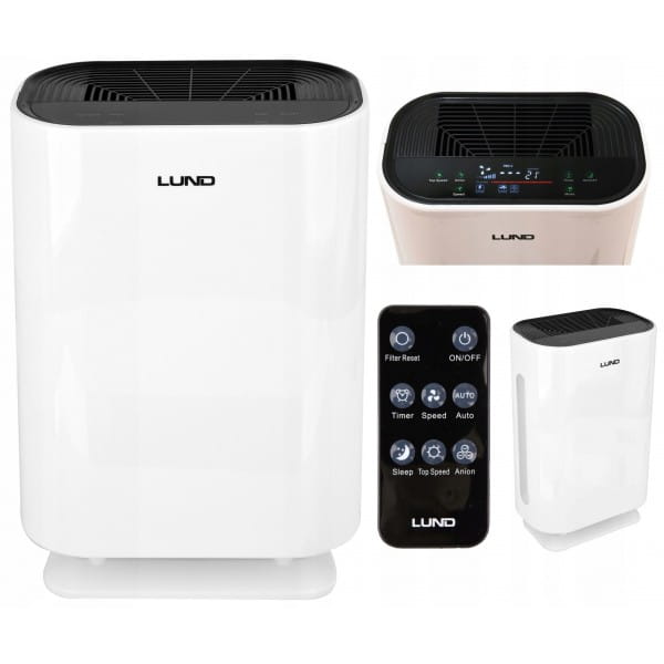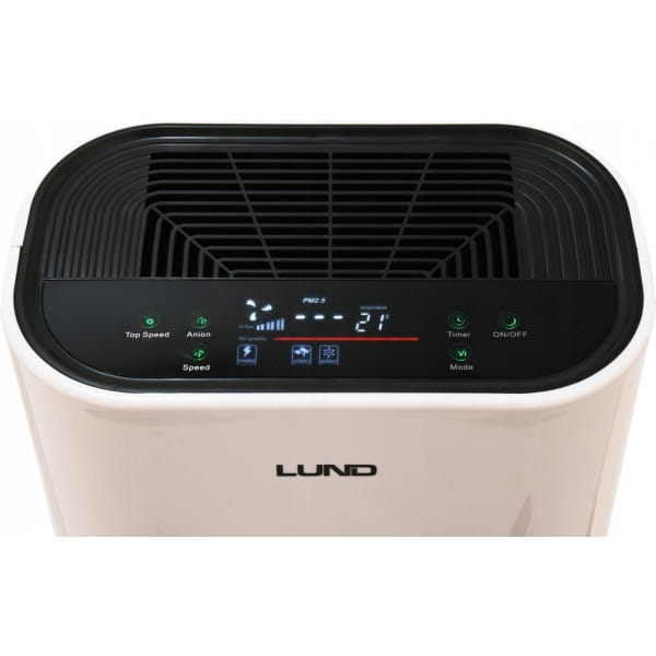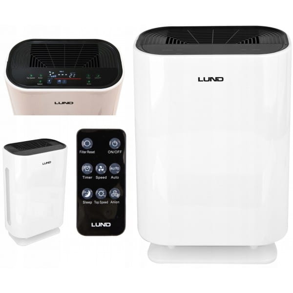 Oczyszczacz powietrza LUND o mocy 40W i wydajności 220 m3/h przeznaczony do pomieszczeń o powierzchni do 35m2. Wysoką jakość oczyszczania zapewnią 4 składowe – filtr wstępny, filtr HEPA, filtr węglowy oraz jonizator. Cyfrowy panel sterowania umożliwi odczyt informacji, ustawienie różnych trybów i jedną z 3 prędkości pracy. Do najważniejszych funkcji urządzenia można zaliczyć tryb AUTO, tryb SLEEP, czasomierz, funkcję przypominania o wymianie filtra oraz odczyt temperatury w pomieszczeniu