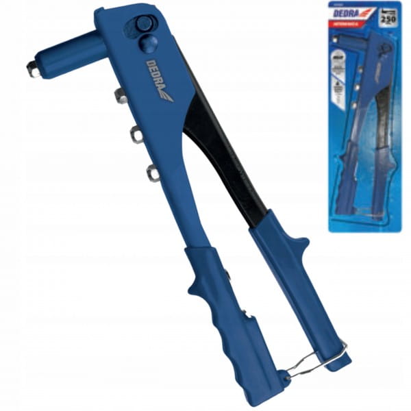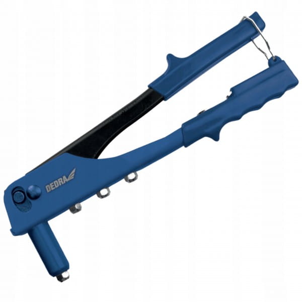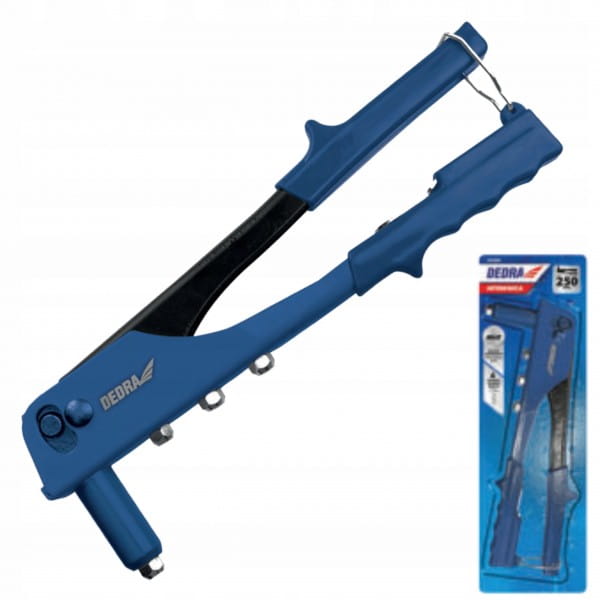 Nitownica to jedno z przydatniejszych narzędzi w każdym warsztacie czy domu. Pozwala szybko i trwale połączyć elementy poprzez przeciśnięcie i rozklepanie metalowego trzpienia przeprowadzonego przez otwór w dwóch złączanych powierzchniach materiałów. Nitownica do nitów aluminiowych DEDRA 11Y001 dzięki długim ramionom pozwala na wygodną i efektywną pracę. Wymienne końcówki pozwalają na dobór średnicy nitu do konkretnego otworu. 4 wymienne końcówki mocowane są w korpusie nitownicy dzięki czemu są one zawsze pod ręką i trudniej je zgubić. Nitownica posiada blokadę rozwarcia ramion co ułatwia transport i przechowywanie narzędzia. Korpus nitownicy jest stalowy co zapewnia odpowiednią wytrzymałość i sztywność. 250mm długości ramiona pozwalają na efektywną pracę. Rączki zostały wykończone profilowanym tworzywem sztucznym zwiększającym komfort użytkowania. Szczęki nitownicy wykonano ze stali chromowo molibdenowej (20CrMo) co zapewnia zwiększoną wytrzymałość i większą elastyczność niż tradycyjna stal (są mniej kruche, mniej podatne na uszkodzenia)