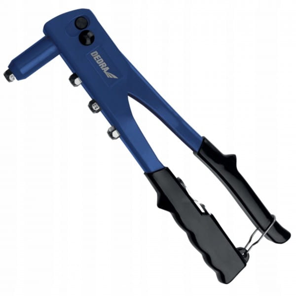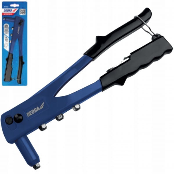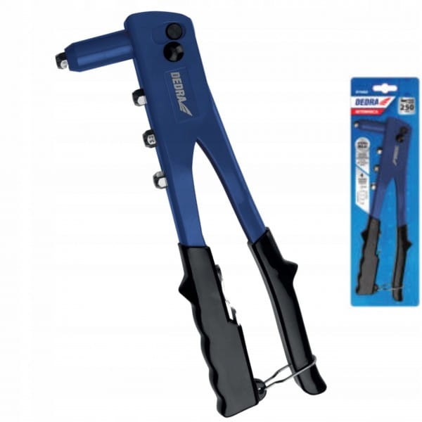 Nitownica to jedno z przydatniejszych narzędzi w każdym warsztacie czy domu. Pozwala szybko i trwale połączyć elementy poprzez przeciśnięcie i rozklepanie metalowego trzpienia przeprowadzonego przez otwór w dwóch złączanych powierzchniach materiałów. Nitownica do nitów aluminiowych i stalowych DEDRA 11Y002 dzięki długim ramionom pozwala na wygodną i efektywną pracę. Wymienne końcówki pozwalają na dobór średnicy nitu do konkretnego otworu. 4 wymienne końcówki mocowane są w korpusie nitownicy, dzięki czemu są one zawsze pod ręką i trudniej je zgubić. Nitownica posiada blokadę rozwarcia ramion co ułatwia transport i przechowywanie narzędzia. Korpus nitownicy jest stalowy co zapewnia odpowiednią wytrzymałość i sztywność. 250mm długości ramiona pozwalają na efektywną pracę. Rączki zostały wykończone profilowanym tworzywem sztucznym zwiększającym komfort użytkowania. Szczęki nitownicy wykonano ze stali chromowo molibdenowej (20CrMo) co zapewnia zwiększoną wytrzymałość i większą elastyczność niż tradycyjna stal (są mniej kruche, mniej podatne na uszkodzenia)