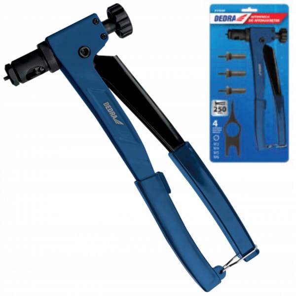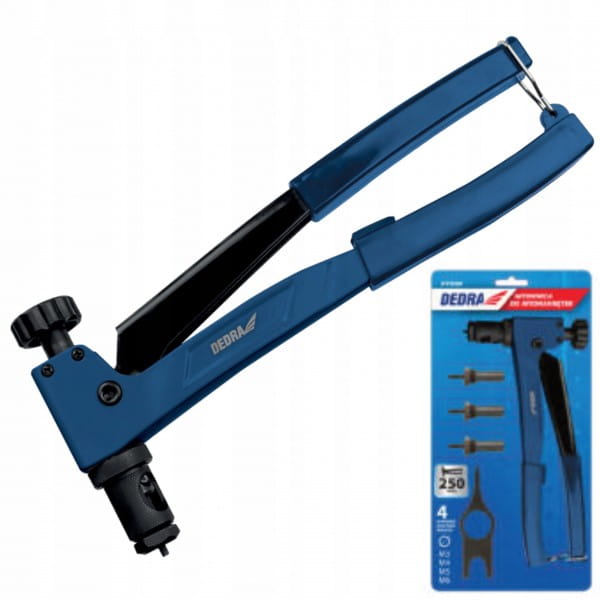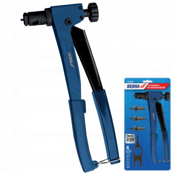 Nitownica do nitonakrętek DEDRA 11Y030 dzięki specjalnej konstrukcji pozwala na wygodną i efektywną pracę. 4 wymienne końcówki pozwalają na dobór średnicy nitonakrętki do konkretnego otworu - mocowane są w korpusie nitownicy, dzięki czemu są one zawsze pod ręką i trudniej je zgubić. Korpus nitownicy jest wykonany ze stali co zapewnia odpowiednią wytrzymałość i sztywność. 250mm długości ramiona pozwalają na efektywną pracę. Rączki zostały wykończone profilowanym tworzywem sztucznym zwiększającym komfort użytkowania.