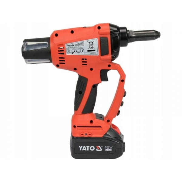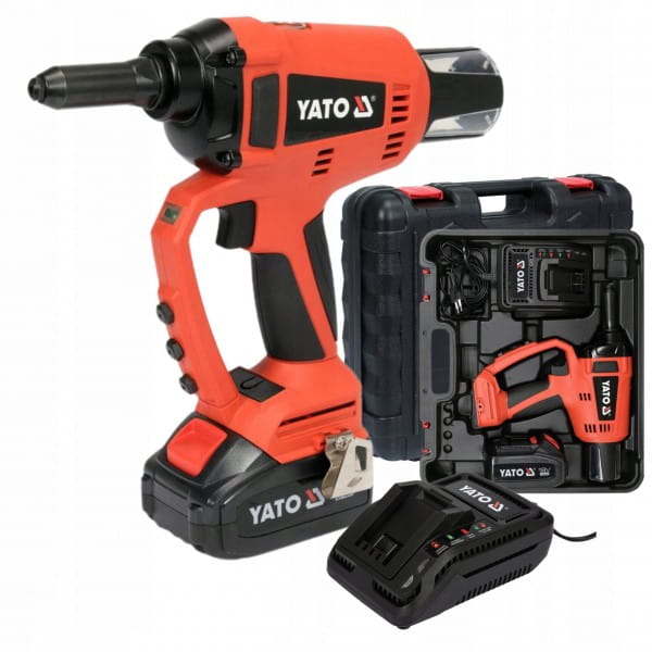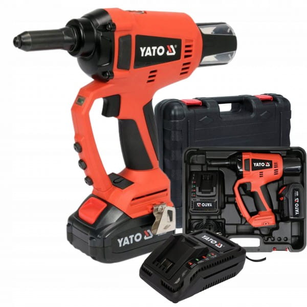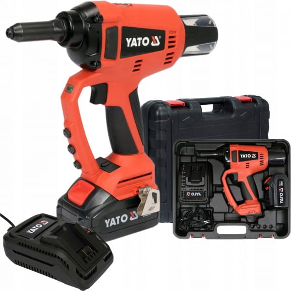 Opis: Nitownica 18V to profesjonalne narzędzie marki Yato z serii GRF, zaprojektowane do stosowania nity ze stali nierdzewnej oraz nity aluminiowych. Jest wyposażona w bezszczotkowy silnik, który zapewnia wysoką wydajność i trwałość. Oferuje wygodę użytkowania dzięki zasilaniu bateryjnemu.