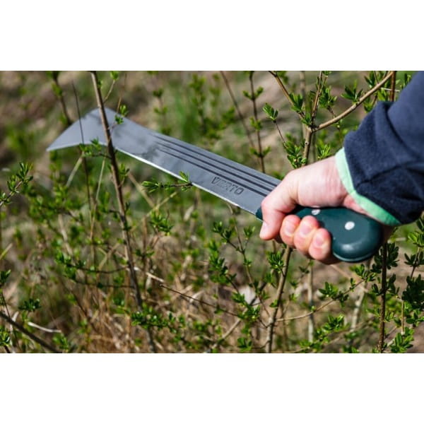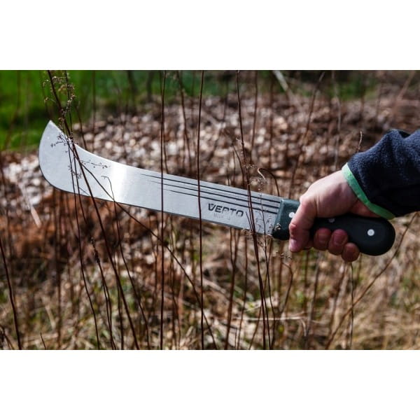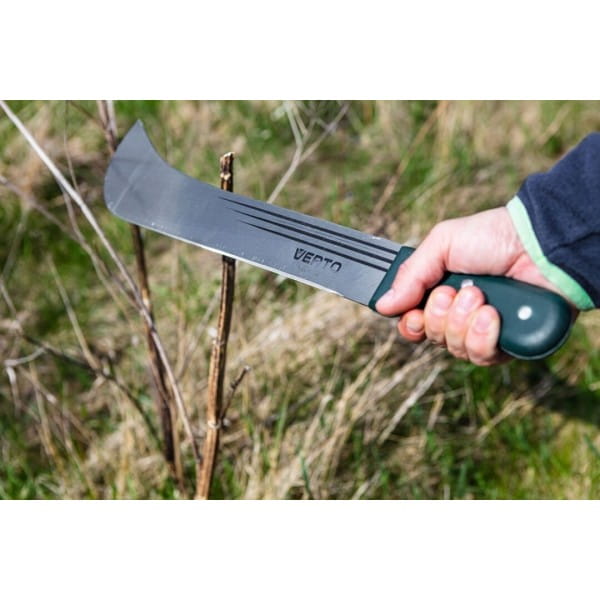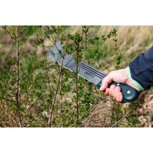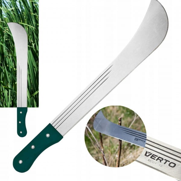 Maczeta ogrodowa 18" 15G191 VERTO to przydatne narzędzie ogrodowe ze specjalistycznym ostrzem i długiej powierzchni cięcia. Maczeta posiada całkowitą długość 455 mm. Została wykonana z hartowanego, niezwykle wytrzymałego ostrza oraz drewnianego, ergonomicznego uchwytu, pewnie leżącego w dłoni. Rękojeść mocowana jest za pomocą nitów, dzięki czemu jego trwałość jest jeszcze większa. Z pomocą maczety można sprawnie wykarczować zarośla, podciąć krzewy lub drzewka oraz okrzesać gałęzie czy konary. Ogrodnicza marka VERTO oferuje narzędzia użyteczne na lata.