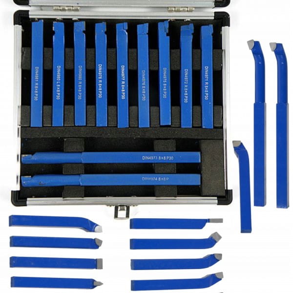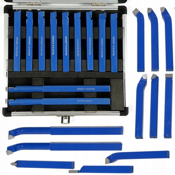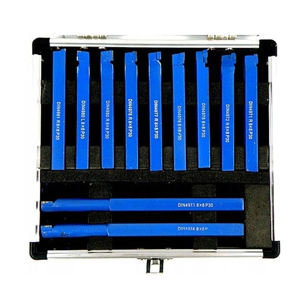 Zestaw noży tokarskich 8x8mm z wysokogatunkowej stali. Ostrza noży z węglika spiekanego umożliwiają precyzyjną obróbkę metali.