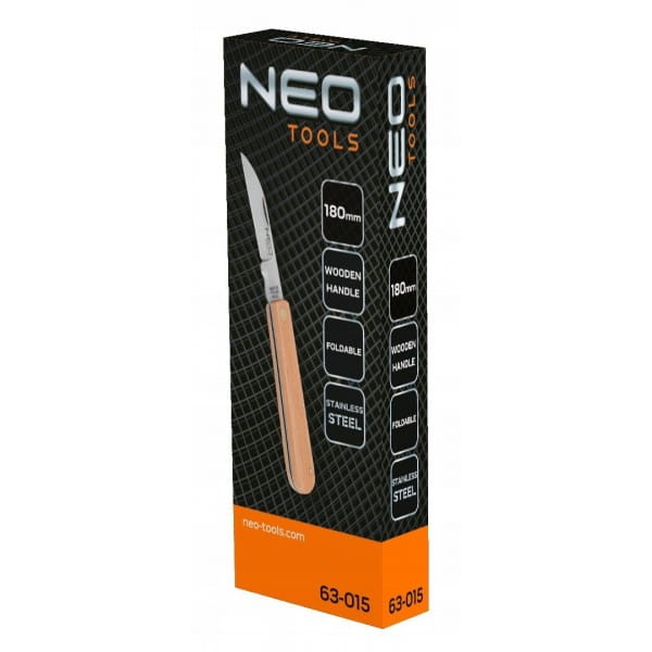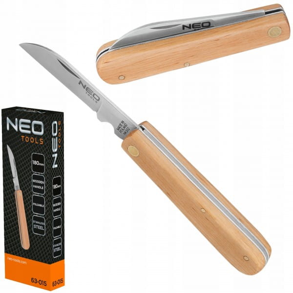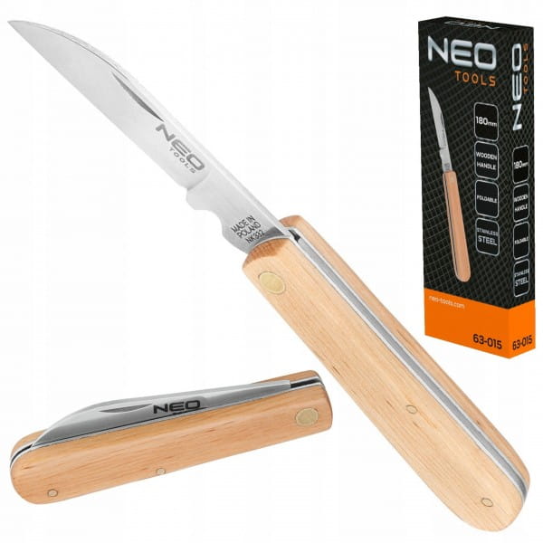Nóż monterski, drewniane okładki 63-015 NEO to uniwersalny nóż dla majsterkowiczów o długości całkowitej 180 mm. Solidne ostrze ze stali nierdzewnej posiada specjalne nacięcie, ułatwiające usuwanie izolacji. Nóż doskonale sprawdzi się w rozmaitych pracach instalacyjnych oraz warsztatowych. Wyposażone w blokadę ostrze, wpływa na bezpieczeństwo i komfort użytkowania.