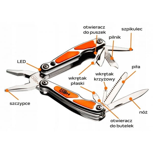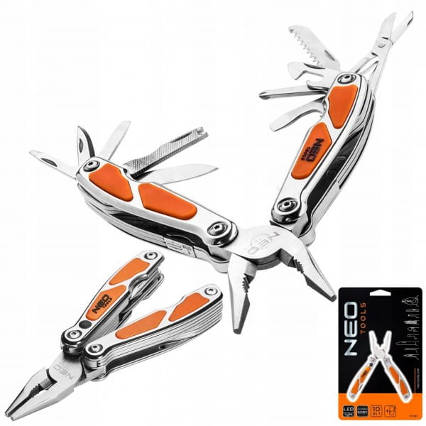 NEO MULTITOOL SCYZORYK NÓŻ SKŁADANY TURYSTYCZNY LATARKA LED 10 FUNKCJI MINI