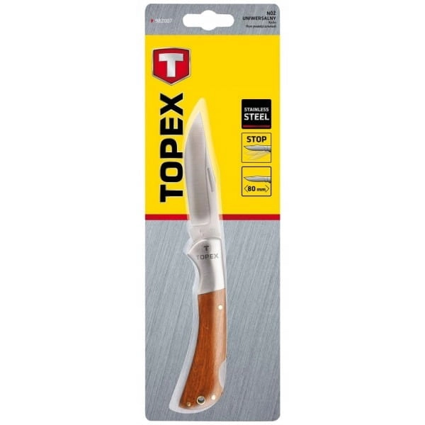 Nóż uniwersalny TOPEX (nr ref. 98Z007) o długości ostrza 80 mm. Korpus oraz ostrze wykonane z wysokiej jakości stali nierdzewnej, co gwarantuje długą żywotność narzędzia. Blokada ostrza zapewnia bezpieczeństwo podczas użytkowania. Dzięki drewnianym okładkom o ergonomicznym kształcie podniesiony jest komfort pracy. Możliwość złożenia ułatwia przechowywanie i transport. Marka TOPEX skierowana jest do majsterkowiczów.