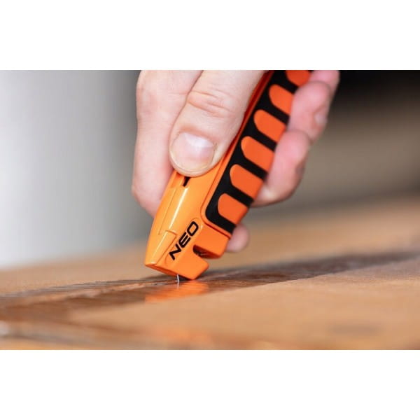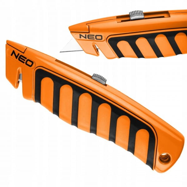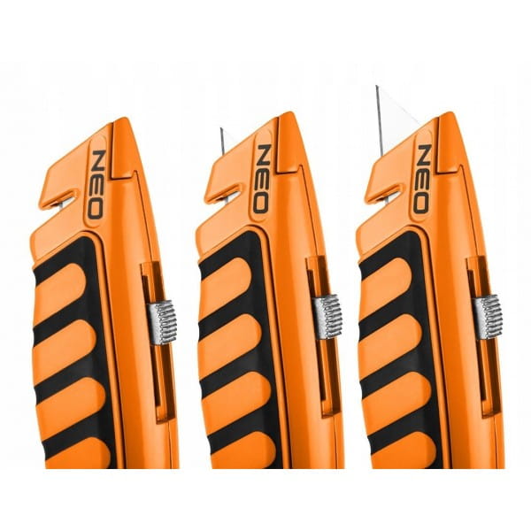 Nóż z ostrzem trapezowym, metalowy korpus 63-707 marki NEO TOOLS to nóż z ostrzem trapezowym, wyposażony w blokadę ostrza. Charakteryzuje się gumowanym uchwytem oraz posiada praktyczną funkcję cięcia linek i pasków. Jego ostrze wykonane zostało z solidnego metalu. To narzędzie marki NEO TOOLS o wielu zastosowaniach.