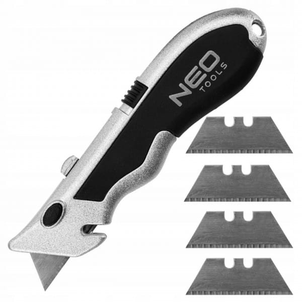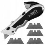 Nóż trapezowy mini + 4 ostrza 63-703 NEO TOOLS to praktyczne narzędzie, które spełnia różne potrzeby - zarówno profesjonalistów, jak i amatorów. Jego solidna konstrukcja z aluminium zapewnia trwałość oraz odporność, co jest istotne w codziennym użytkowaniu. Wyposażony w magazynek na zapasowe ostrza, nóż ten umożliwia łatwą i szybką ich wymianę, zwiększając funkcjonalność, a także wydajność w pracy.