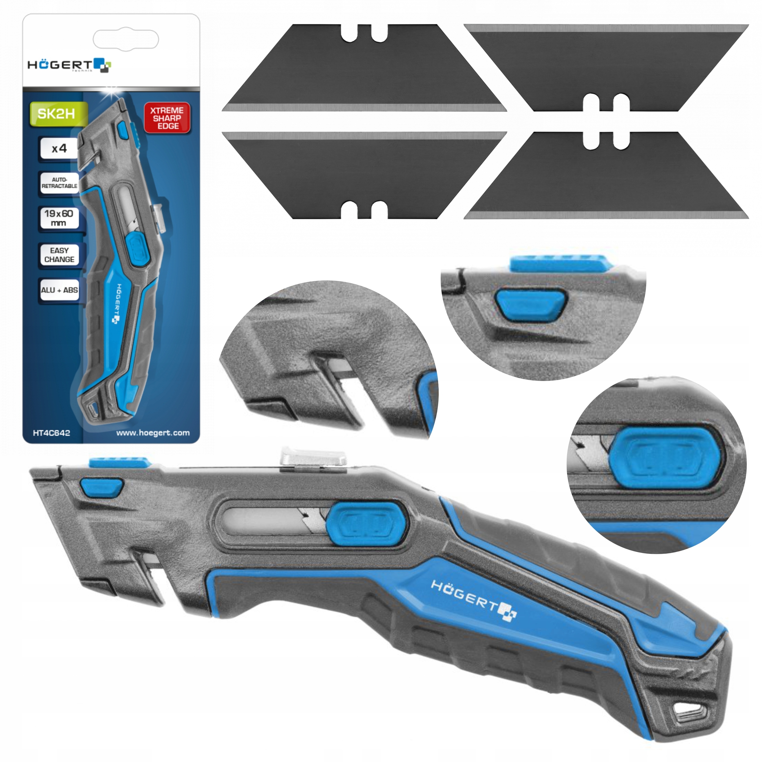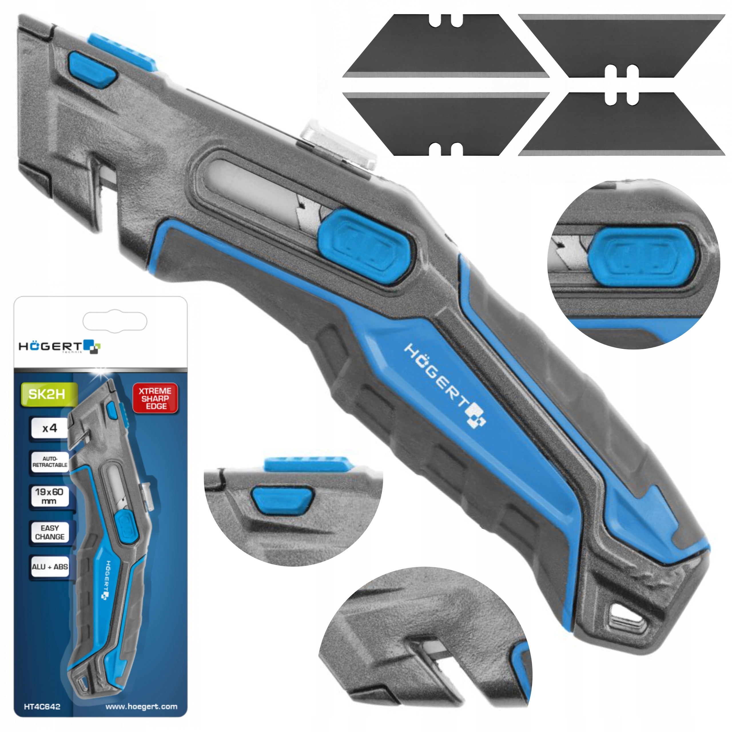 Nóż z ostrzem trapezowym, uniwersalnego zastosowania, pomocny przy do wykonywaniu prac wykończeniowych. Przeznaczony szczególnie do cięcia kartonów, tapet, wykładzin, tkanin plandekowych, folii drukarskich oraz folii PVC, itp.