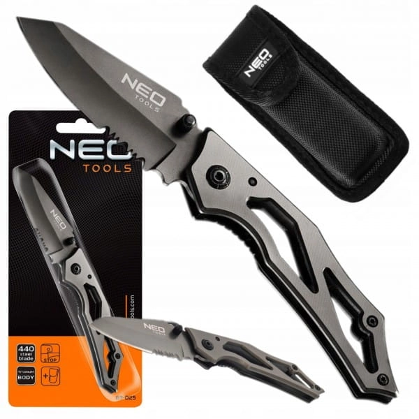 Nóż składany z blokadą NEO posiada ostrze wykonane ze stali 440 o długości 7 cm. Tytanowa obudowa zapewnia długą żywotność narzędzi. Blokada przed nieoczekiwanym zamknięciem zapewnia bezpieczeństwo podczas pracy. Pokrowiec z wytrzymałego nylonu ułatwia przechowywanie i transport