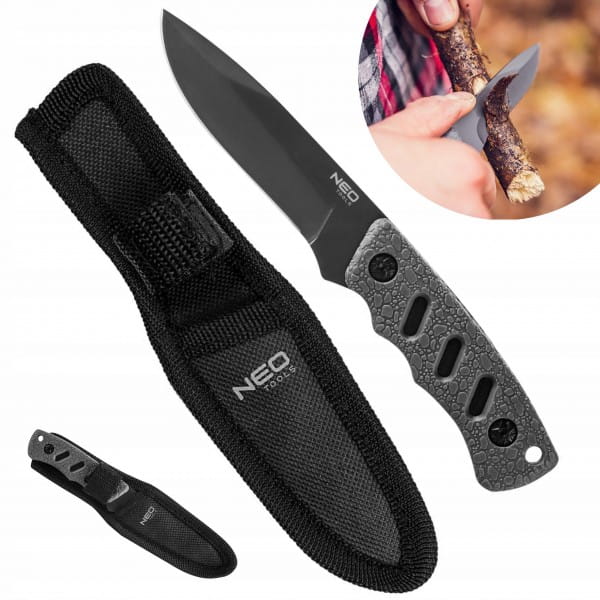 Nóż bushcraftowy full-tang, 63-106, NEO o długości 16.5 cm i ostrzu 9,4 cm wyprodukowany został z wysokiej jakości stali nierdzewnej, odpornej na uszkodzenia mechaniczne. Ten nóż warto mieć przy sobie podczas wyprawy w góry, biwakowania w lesie czy rajdów terenowych. Rękojeść full-tang, czyli z pełnym trzpieniem pokryty gumową powłoka TPR, zapewnia mocny chwyt i dużą wytrzymałość. Nóż został wyposażony w nylonowy pouch na pasek.