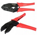Profesjonalne, ręczne nożyce do cięcia blach. Szczęki odkuwane ze stali chromowo molibdenowej /CrMo/, utwardzane do ok. 60-62 HRC, hartowane indukcyjnie. Do cięcia blach stalowych o grubości do 1.2 mm i stali nierdzewnych do grubości 0,7 mm. Długość całkowita 235 mm.